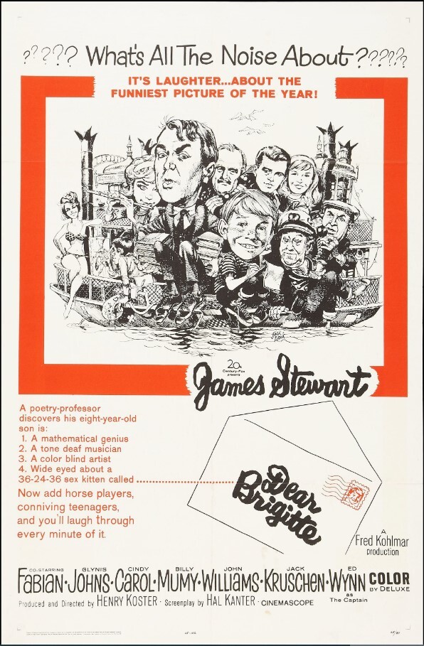 《亲爱的布丽吉特》是20世纪60年代最有趣的喜剧之一,讲述了一个音盲、色盲的天才男孩,她有一个兴趣:布丽吉特·芭铎。詹姆斯·斯图尔特扮演罗伯特·利夫教授,一个典型的大学教授(当谈到大学教授时,典型的意思是自由主义,但这是40年前的事了,标签也变了)。叶教授诗歌,住在旧金山的一艘游艇上,口头上反对核能和总体上的进步。他有一种独特的方式来让这个家庭团结在一起——家庭音乐会。他的女儿称他正直。Leaf 8岁的儿子Erasmus由Billy Mumy饰演(Sammy the Way Out Seal,Lost In Space,Bless the Beasts&Children,Three Wishes)。Leaf希望在他唯一的儿子身上找到某种艺术天才,并在音乐、绘画、文学等方面培养他。但Leaf很失望,说得委婉一点,当伊拉斯谟有数学天赋时,他能超越大学最新的计算机,立即计算出赛马的获胜者。我不想透露太多的情节,但伊拉斯谟一直定期给芭铎写信,在家人开始依赖他的能力后,他的爱情病会导致精神障碍。Glynis Johns(《父亲的娇弱》、《卡利加里内阁》、《玛丽·波平斯》)饰演Leaf的妻子。艾德·韦恩(《重量级人物安魂曲》,玛丽·波平斯)是一位邻居/队长/叙述者。其他演员包括Fabian、Cindy Carol、John Williams、Jesse White、Jack Kruschen和James Brolin。布里吉特·芭铎出现在最后。