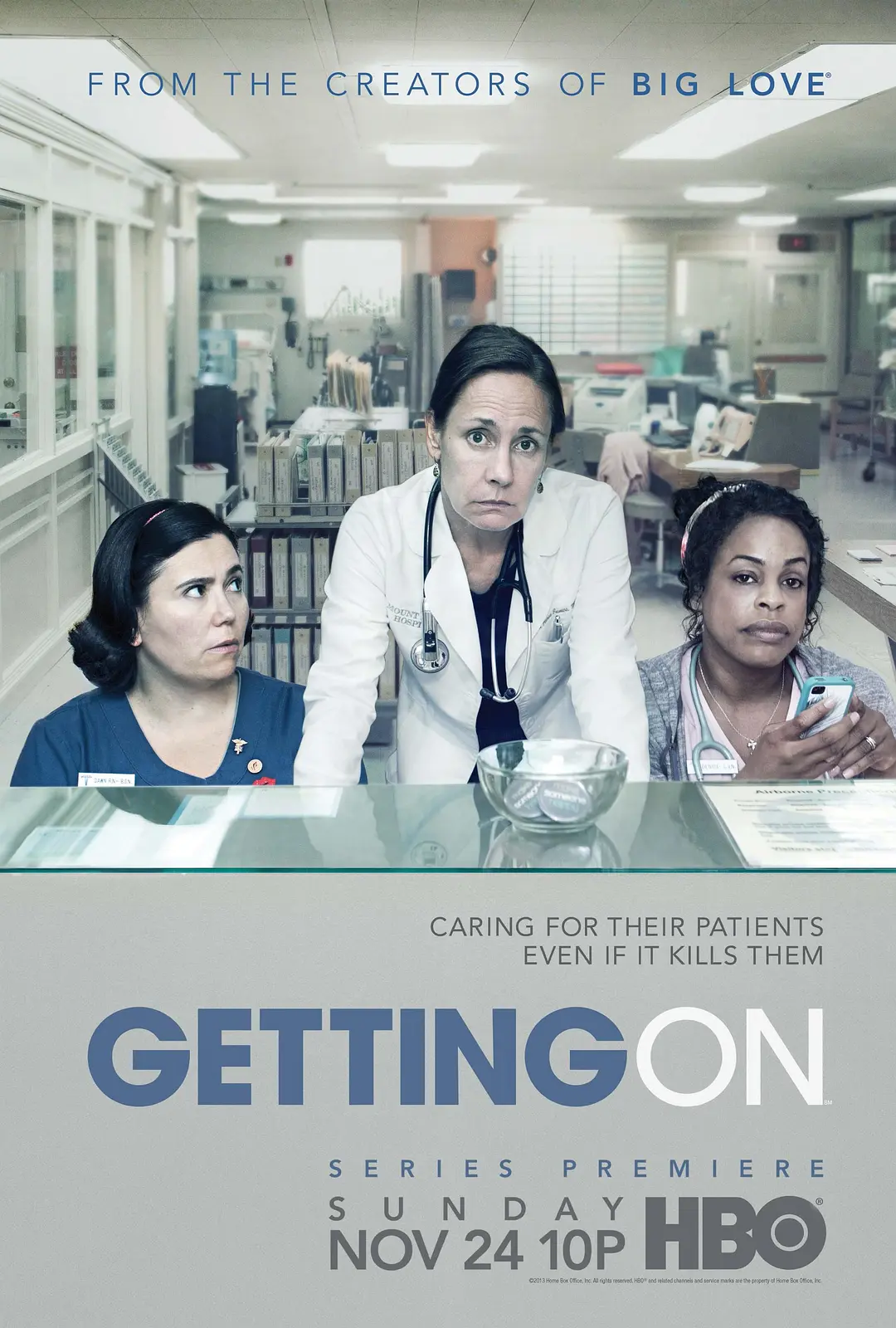 《Getting On》以一家落后医院的老年扩展护理病房为背景,讲述了护士、焦虑的医生和管理人员与照顾老年人的黑暗喜剧、残酷诚实和默默同情的现实作斗争的故事。
