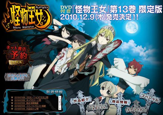 【作品情报】《怪物王女》第13卷附DVD限定版发售日期:2010年12月9日(周四)价格:3480(含税)内容:《怪物王女》第13卷单行本(限定版)原创动画DVD《暗暗王女》(收录时间:25分钟)【故事简介】《怪物王女》前提提要:被称作怪物的异形种族。作为王族一员为争夺王位而战斗的姬。不幸在事故中身亡的少年日郎侥幸得到了姬的血液复活。然而,拥有不死之身的少年必须从此之后作为血之战士战斗。为了王位之争而你死我活的亲族斗争。被卷入阴谋和憎恨中的姬以及血之战士。接踵而来的是渐渐明朗的王族之迷。姬和日郎的战斗正在经历越来越艰难炙烈的战斗。《暗暗王女》故事简介:校园里秘密扩散着阴晦的传闻。姬的房间也突然出现了神秘的侵入者。侵入者来而复返攻击愈演愈烈,他们的真实身份究竟是……!?【CAST】姫:早见沙织日郎:入野自由弗兰朵:井口裕香丽莎:喜多村英梨令里:丰崎爱生纱和々:茅野爱衣【STAFF】原作:光永康则(讲谈社《月刊少年シリウス》连载)监督·分镜:川口敬一郎(《绝对可怜小孩》《旋风管家!》监督)监督写作:吉原达矢(《vicesurviveR》作画監督)人物设定·作画监督:贞方希久子(《尸姫》人物设定、《天元突破红莲之眼睛》作画监督)美术监督:椋本丰(《紫音之王》、《月面兔兵器米娜》、《四叶游戏》美术监督)音乐:田光マコト(《绝体绝命老爷子》音乐)动画制作:龙之子